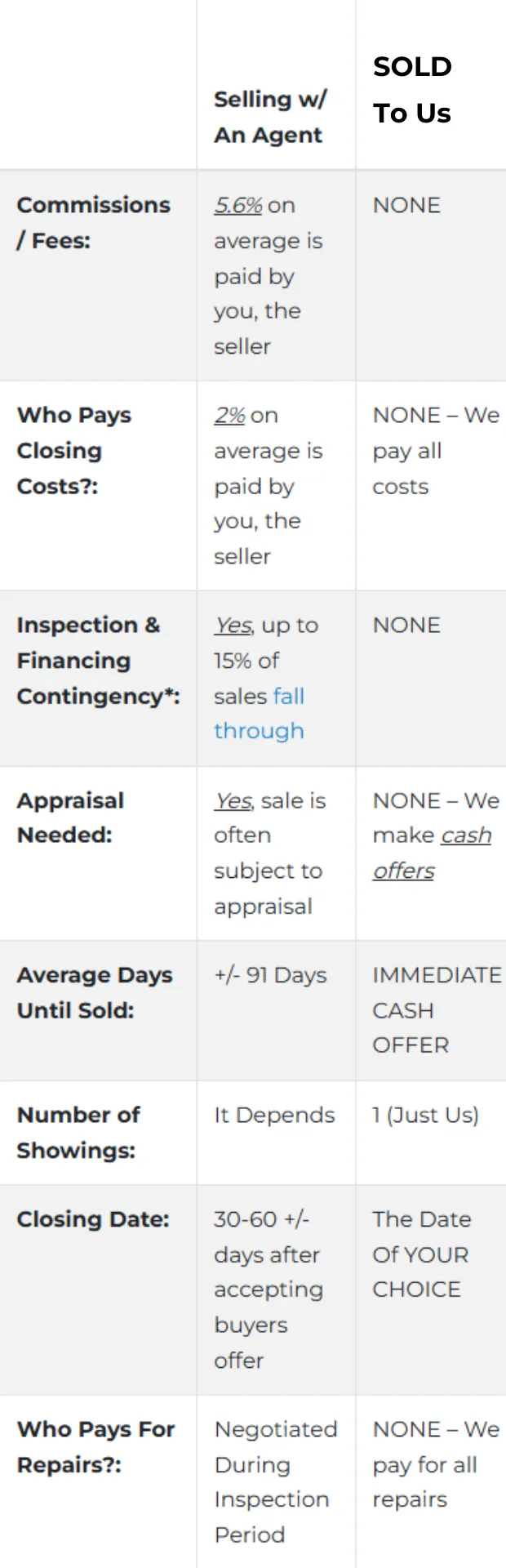 You can get rid of the headache of that property fast and avoid paying any more utility payments, tax payments, insurance payments, mortgage payments, you get the drill. If you list your house and wait 90+ days to close… you have to figure in all of the costs of holding that property during the time you have that property listed and are waiting for the property to close.